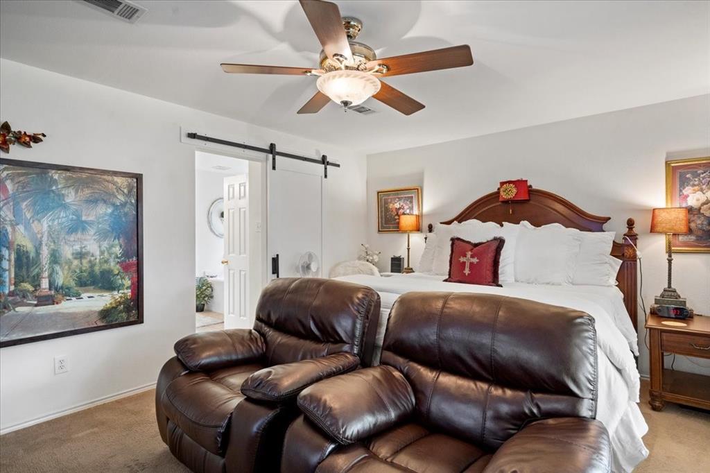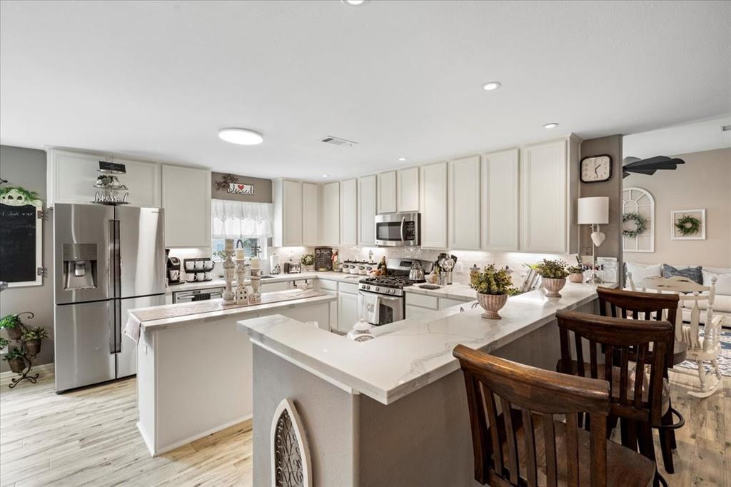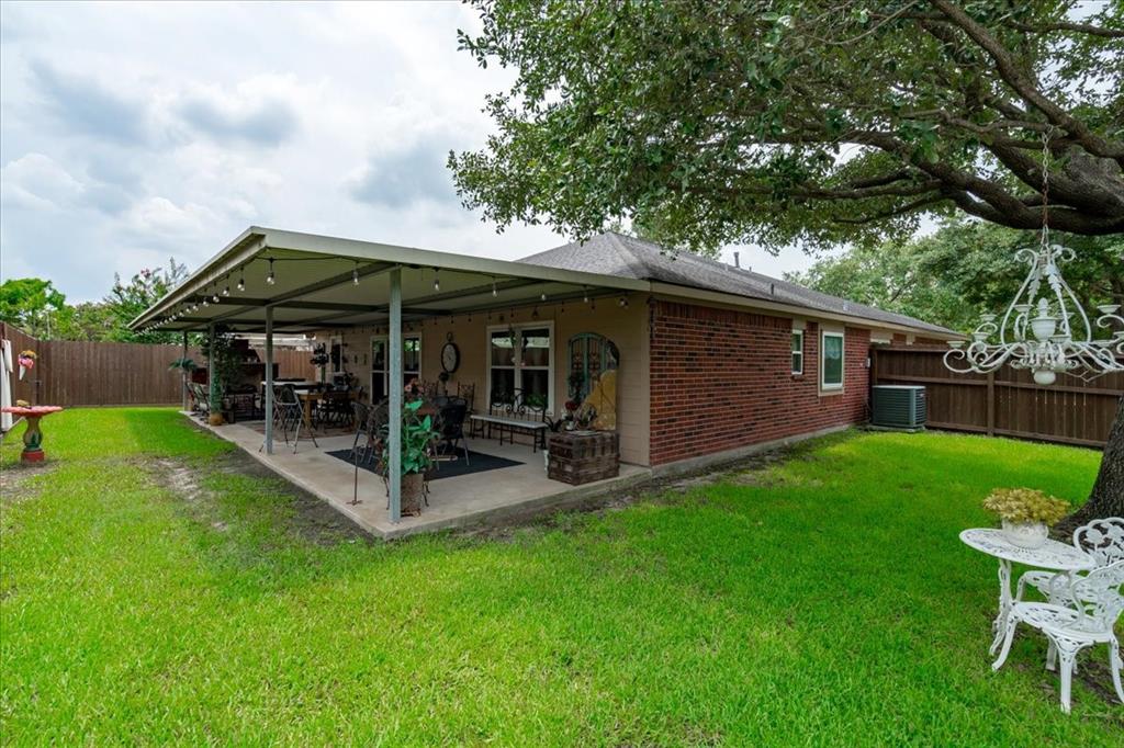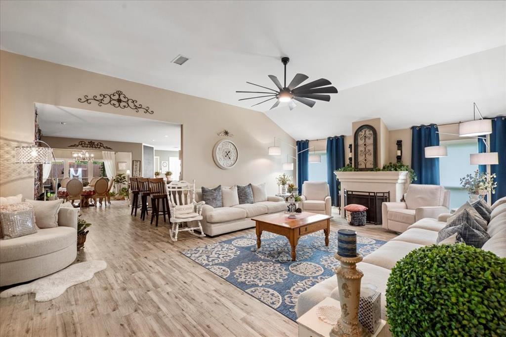 Schedule your tour Now for this Beautiful Designer Curated One Story Home set on a Corner Lot! Tastefully Updated, High Ceilings & Wood Look Tile Floor Welcome you into the Large Living Area. Complete w/ Gas Fire Place, Upgraded Modern Fan this Space is perfect for Entertaining. Large Recently Remodeled Chef's Kitchen w/ Multiple Workspaces, Light Cabinetry & Countertops, Large Basin Sink, Island, Breakfast Bar, Gas Range, New Appliances & Fantastic Storage Options. Seating available in both the Breakfast Room & Large Formal Dining. Spacious Primary Bedroom at the Back of the Home w/ sitting Area. Barn Door to Spa like Primary Bath w/ Dual Sinks, WC, Soaking Tub & Separate Shower. Massive Primary Closet Dressing Area. At the front of the home 2 Light & Bright Generously Sized Secondary Bedrooms & Secondary Bath. Oversized Home Office w/ French Doors. Out back the extended Back Patio Exceeds Expectations! Full Brick Gas Fireplace & Multiple Seating Areas. Schedule your Tour Today!