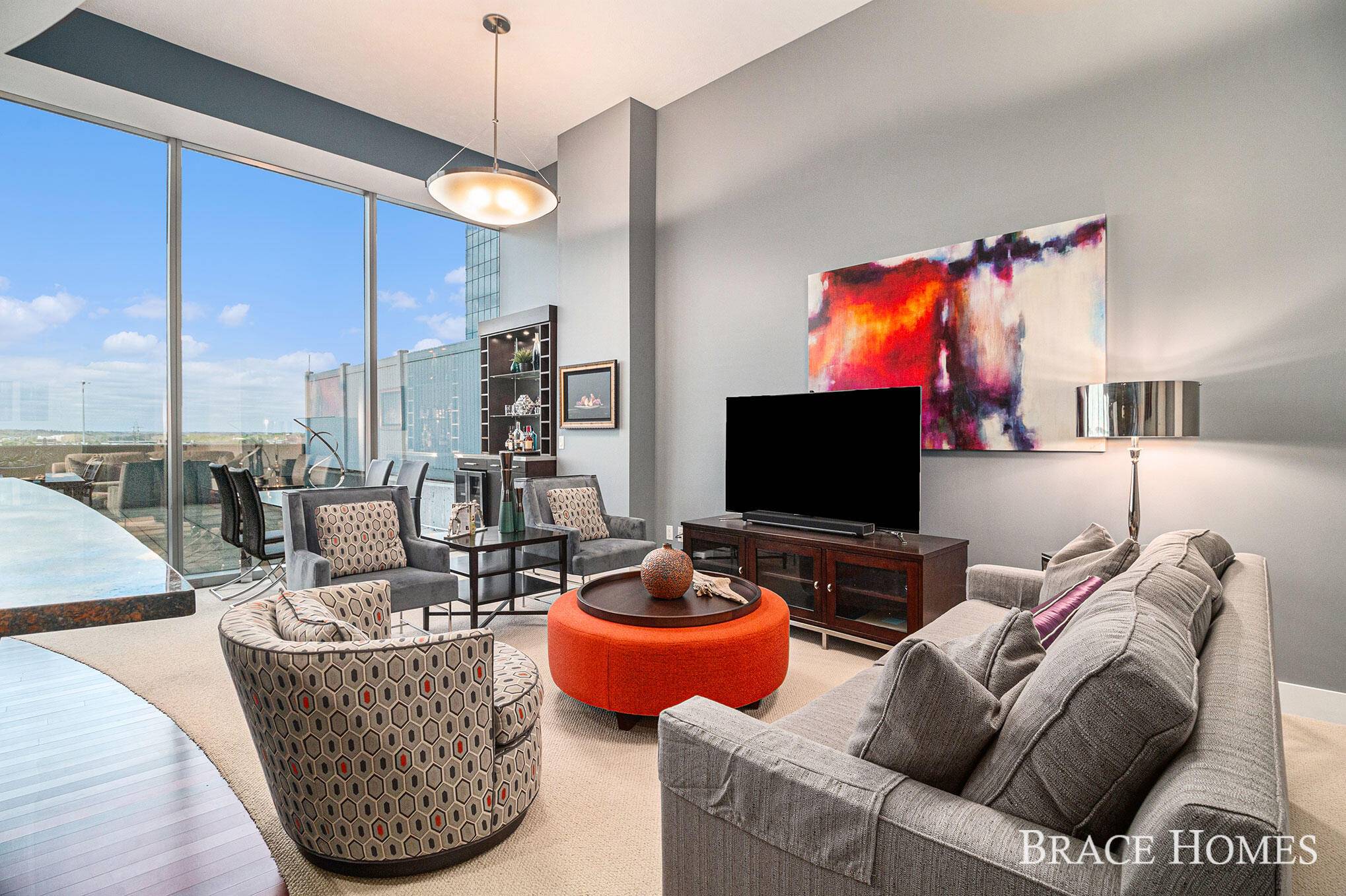 RARE Opportunity To Get Only 1 of 4 Condos at The Riverhouse With This Sized Patio! Breathtaking City Views With This 2 BR/2 BA Condo Located In The Riverhouse, One of Grand Rapids Most Sought After Condominium Buildings! Modern & Stylish Interior With Open Floor Plan That Features An Eat-Up Snack Bar, Floor to Ceiling Windows, Built-In Dry Bar/Coffee Bar, Expansive Outdoor Patio Perfect For Entertaining On Summer Nights! Primary En-Suite Includes Private Bath With Soaking Tub, Tile Shower, Walk-In Closet & Sliders To The Outdoor Patio! Riverhouse Offers A Community Fitness Center, Indoor Pool, Gathering Space & This Unit Comes with TWO Dedicated Parking Spots In The Covered, Secure Garage!